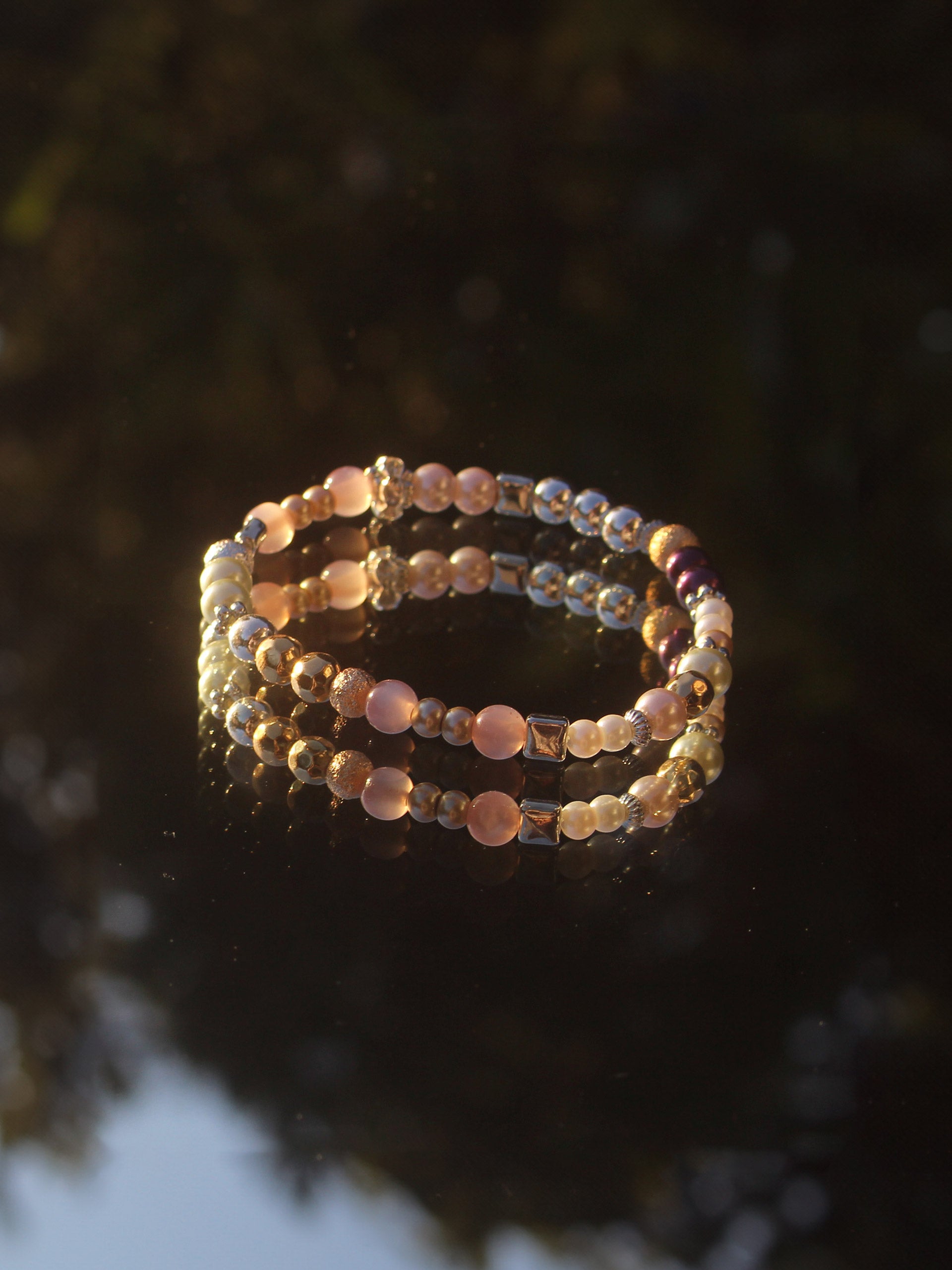 The Sillage Mirage Bracelet is part of our Dreamy Elegance Collection. Light and dreamy pearls with colorful details that shimmer in the sun.